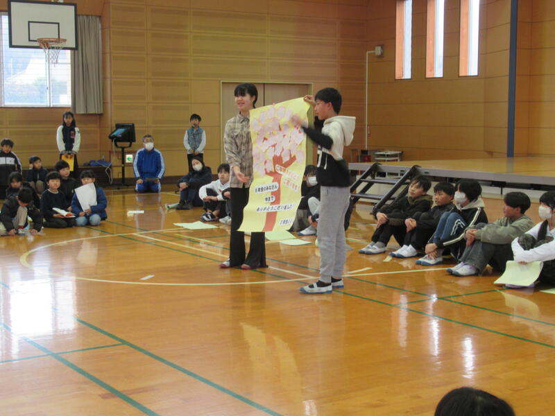 12月19日(金)に、校内人権集会を開きました。当初はもう少し早く開催する予定でしたが、11月に開催した研究発表会の関係で、後ろ倒ししての開催となりました。当日は、それぞれの学年で学習した内容から考えたことの発表や熊本県人権子ども集会に参加した総務委員代表児童の発表等を行いました。最後に、人権教育担当から、「こころのアンケート」の結果について知らせ、課題については職員も一緒に共有していきました。