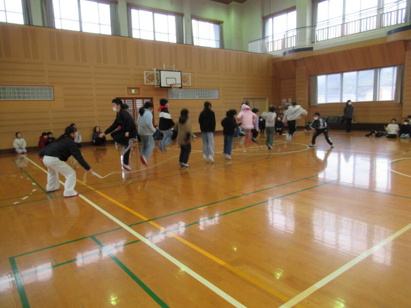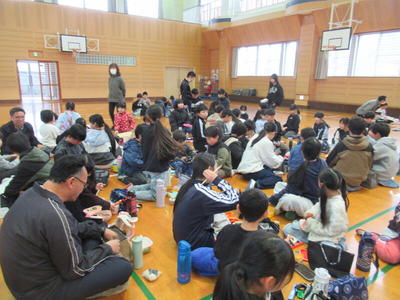 3月6日(金)は、「送別遠足」を予定していました。当初の目的地は、藤棚のある大津山公園でした。雨天の際は、B&Gの体育館を使用できるようにしていましたので、多少の雨であれば傘を差して出かけるつもりでした。しかし、朝から「雷注意報」が発令されていたため断念し、体育館で6年生とのお別れ集会のみ実施しました。             当初の計画では、弁当はそれぞれの教室で食べるようにしていました。しかし、当日、お別れ集会が始まる直前になって、6年生から「体育館で、全員で弁当を食べていいですか?」とのリクエストがあり、縦割り班ごとに、職員も一緒に弁当タイムを楽しみました。これも1つの思い出となりました。