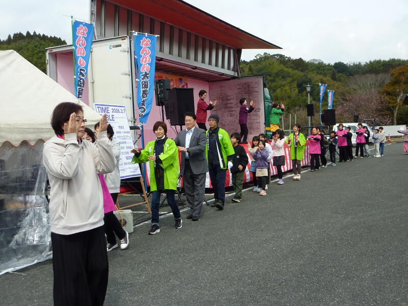 3月7日(土)、まつりの初日に開催されたステージにおいて、2年生から6年生までの児童有志18人が、ukara北側駐車場に設置されたトラックステージにて発表しました。発表内容は、北原白秋作詞・山田耕筰作曲の本校の校歌と、北原白秋作の詩「お祭り」の音読、最後に、「南関音頭」を婦人会の方々、会場にいらっしゃる方々、そして職員有志と一緒に踊りました。