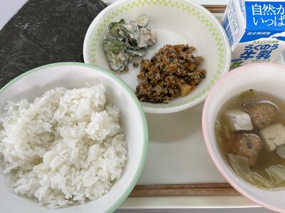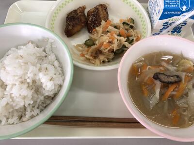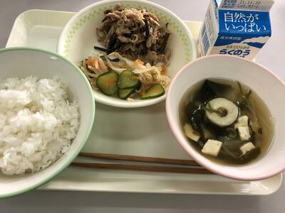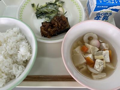 今日のメニューは、たけのこのすまし汁、なすの肉味噌、わけぎの酢味噌あえ、ごはん、牛乳です。