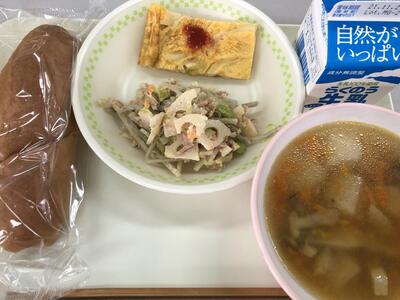 今日のメニューは、玄米パン、牛乳、ベーコンとかぶのスープ、チーズオムレツ、ごぼうとレンコンのサラダです。
