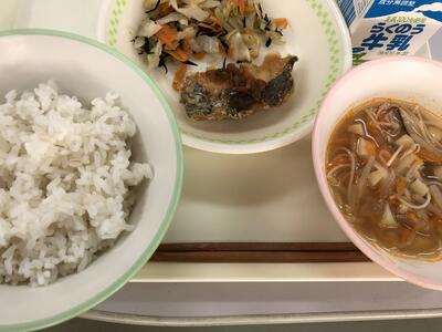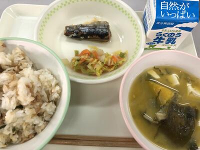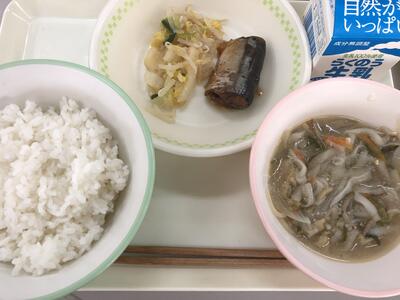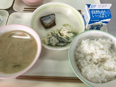 今日のメニューは、みそにゅうめん汁、さんまのおかか煮、ごま酢あえ、ごはん、牛乳です。