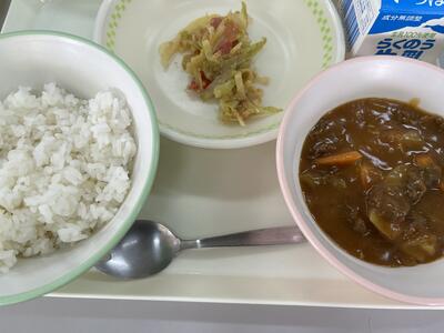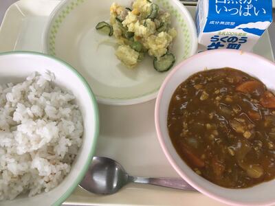 今日のメニューは、ポークカレー、コーンサラダ、牛乳でした。
