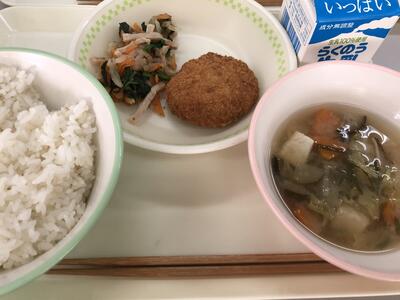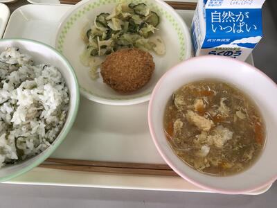 今日のメニューは、大根菜めし、かきたま汁、メンチカツ、ごまみそあえ、牛乳です。