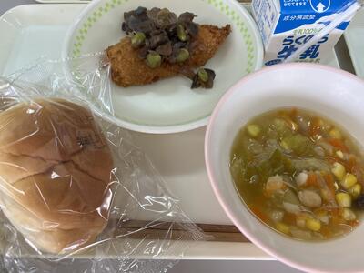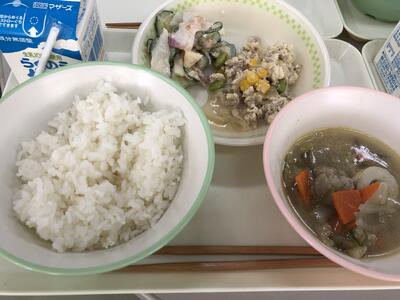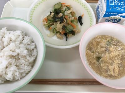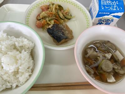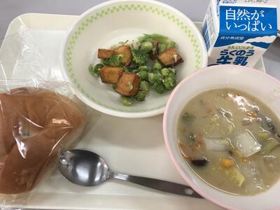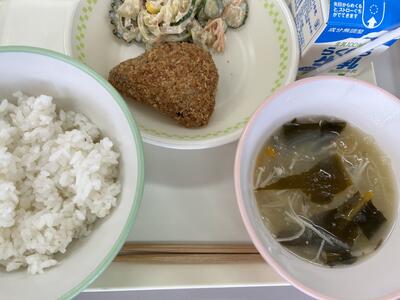 今日は、「まごわやさしい」の頭文字が入ったサラダです。「ま」は豆のことで大豆が、「ご」はごまなどの種実類、「わ」はワカメなどの海藻類、「や」は野菜類、「さ」は魚のことでちりめんが、「し」はしいたけなどのきのこ類でえのきだけが、「い」はいも類でさつまいもが入っていました。これらは全て私たちの体の健康を保つのに必要なものばかりです。おうちでも「まごはやさしい」が入った食事にこころがけてください。