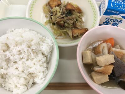 今日のメニューは、さといものそぼろ煮、ざぜん豆、白菜のおかかあえ、ごはん、牛乳です。