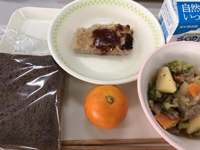 今日のメニューは、ココアパン、じゃがいものベーコン煮、アップルチーズミートローフ、みかん、牛乳です。