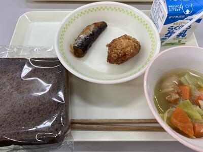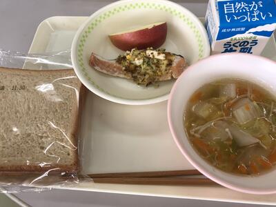 今日のメニューは、黒糖パン、白菜スープ、魚のタルタル焼き、くだもの、牛乳です。