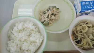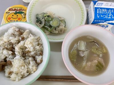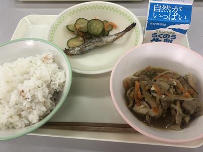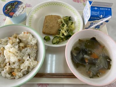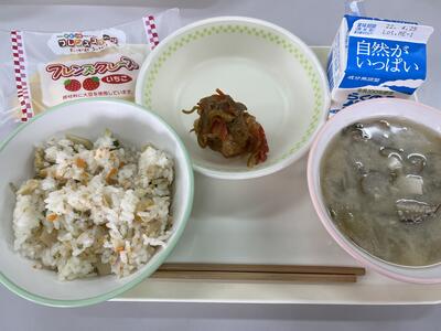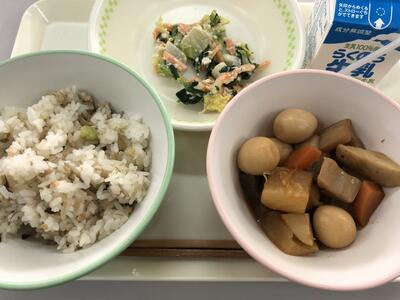 今日のメニューは、とりごぼうごはん、てっか煮、しらあえ、牛乳です。