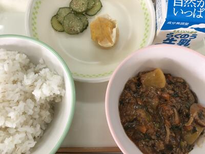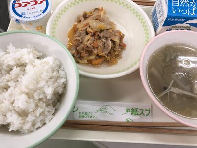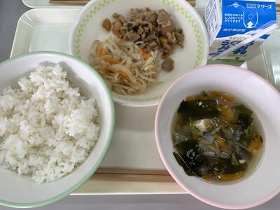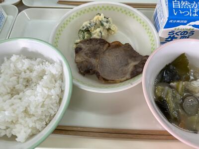 今日は、韓国風のメニューでした。日本でもおなじみの韓国料理「ビビンバ」は、韓国語では「ピビンパ」と発音し、「ピビン」は「混ぜる」、「パ」は「ごはん」という意味だそうです。だから、ごはんと具を混ぜて食べるとおいしいのですね。豚肉のほかに、しいたけやわらび、たけのこなどの野菜もたっぷり入っていました。ごはん、肉、野菜が一緒にとれて栄養バランスもバッチリです。今日も残さずいただきました。