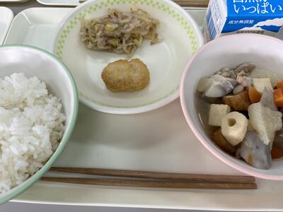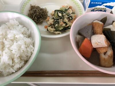 今日のメニューは、おでん、ちりめんの炒り煮、卯の花サラダ、ごはん、牛乳です。