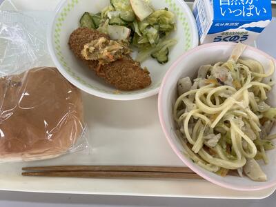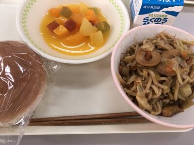 今日のメニューは、米粉パン、やきそば、フルーツのオレンジソース和え、牛乳です。