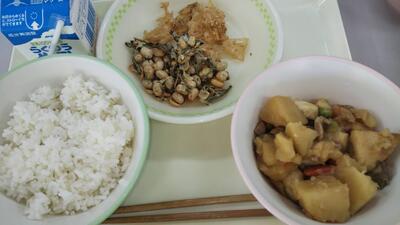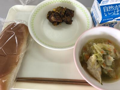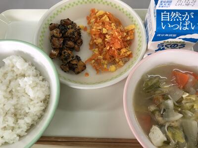 今日は、いわしの梅煮でした。甘辛い醤油だれと一緒に梅干しを入れて煮てありました。濃い味付けでごはんにぴったりでしたよ。高圧力で調理され、骨までやわらかく、残すところなく食べることができ、カルシウムもたっぷりとれました。いつもおいしい給食をありがとうございます。