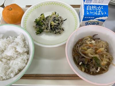 今日のメニューは、ぴり辛汁ビーフン、魚の中華風蒲焼き、浅漬け、麦ご飯、牛乳です。