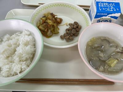 今日のメニューは、白菜のとろとろスープ、照り焼きチキン、しらあえ、ごはん、牛乳です。