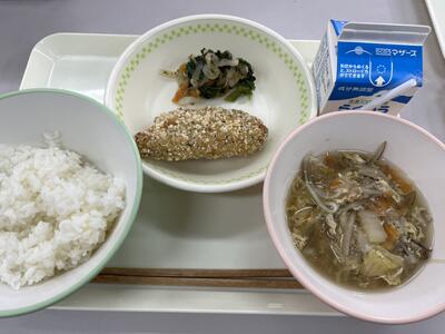 今日は「ごまドレッシングサラダ」でした。ごまは、一粒は小さいですが、さまざまな栄養がふくまれています。とくに、骨をつくるカルシウムや、血をつくる鉄などがたくさんふくまれています。また、ごまはそのまま食べるより、つぶしてするごまにすると栄養が吸収されやすいそうです。今日のごまドレッシングサラダには、すりごまがたっぷりはいっていました。のこさず、おいしくいただきました。