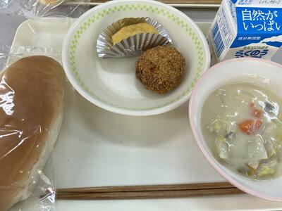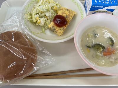 今日のメニューは、米粉パン、クリームシチュー、チーズオムレツ、コールソロー、牛乳です。