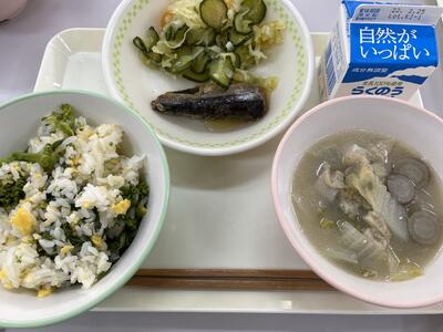 給食では、大根の根を使うことが多いですが、今日は大根の葉を使ったご飯でした。大根の葉には、β-カロテン、ビタミンC、ビタミンK、葉酸などを豊富に含みます。 とくにβ-カロテンは根には含まれない栄養素です。 ミネラル類のカリウム、カルシウムなども根より、葉のほうに含まれます。大根を植えると、芽が出てきますが、混み合っているので、「間引き」をすることで、大きく育ちます。間引きした葉もおいしく食べることができ、捨てることが少ない野菜です。栄養たっぷりの給食を、今日も残さずいただきたいと思います。