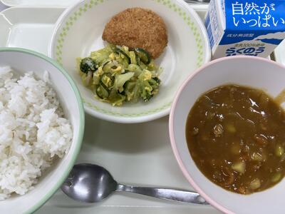 今日のメニューは、カツカレー、ミモザサラダ、牛乳です。
