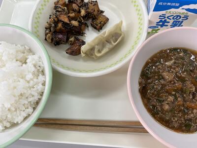 今日のメニューは、マーボー大根、ぎょうざ、さつまいもと大豆のごまがらめ、牛乳です。