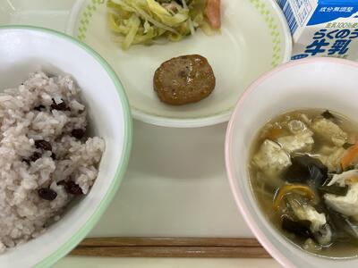 今日のメニューは、赤飯、節そうめん汁、レンコンつくね、みそドレッシングサラダ、牛乳です。
