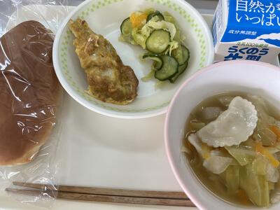 今日のメニューは、ミルクパン、ラビオリスープ、魚のピカタ、デコポンサラダ、牛乳です。