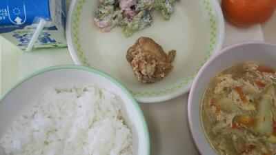 今日のメニューは、たまごスープ、とりのからあげ、ブロッコリーとツナのサラダ、みかん、牛乳です。