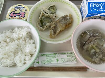 今日のメニューは、節そうめんの味噌汁、魚のかわり蒲焼き、白酢あえ、麦ご飯、牛乳です。