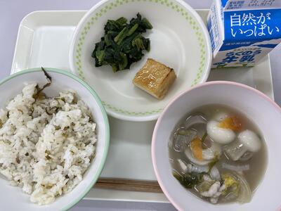 今日のメニューは、白玉団子汁、田楽、ほうれん草のごま和え、高菜ご飯、牛乳です。