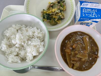 今日のメニューは、きのこカレー、さつまいもサラダ、牛乳です。
