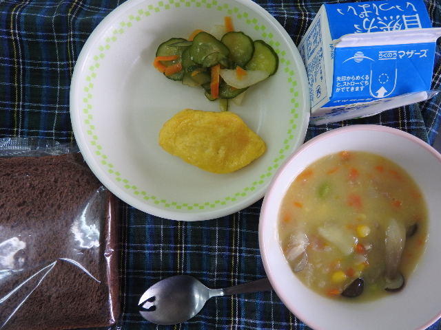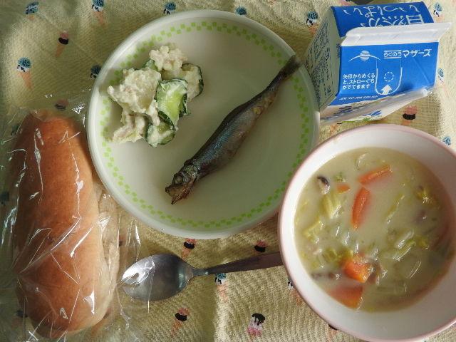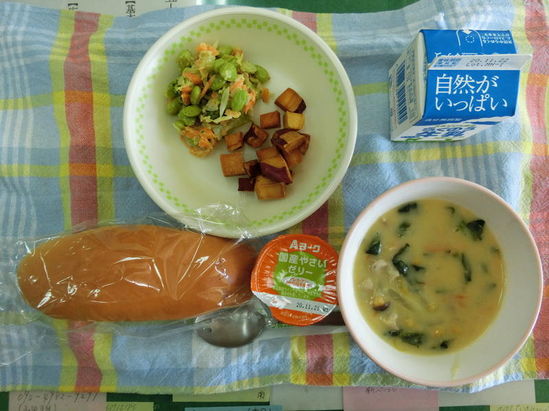 今日のメニューは、コッペパン、きのこの豆乳シチュー、秋の味覚サラダ、野菜ゼリー、牛乳(620カロリー、たんぱく質21.7g)でした。今日もおいしくいただきました。感謝!