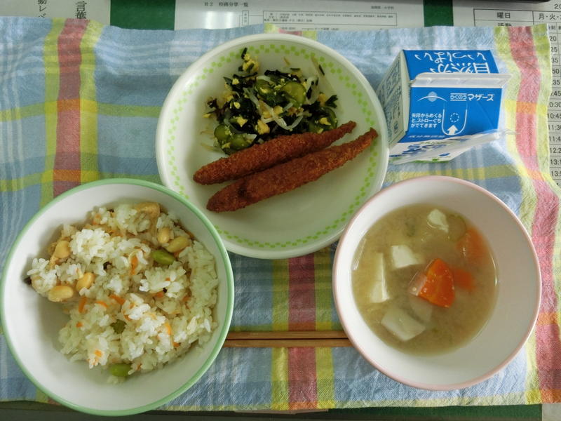 今日のメニューは、むぎごはん、すましじる、だいずととうふのフライ、かきなます、牛乳(683カロリー、たんぱく質21.5g)でした。ごちそうさまでした。