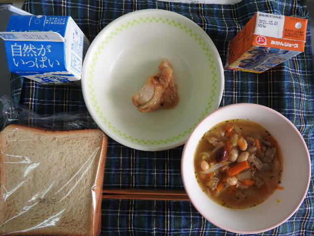 今日のメニューは、黒糖パン、牛乳、ジューシー、ビーンズスープ、チキンのなしだれ焼き 683㎉ タンパク質27.5g チキンのなしだれ焼きは、名前からして、すりつぶしたなしにつけこんで焼いてあるのかもしれません。美味しかったです。感謝。運動会の練習もスタートしました。しっかり食べること、そして「早寝・早起き・朝ごはん」をよろしくお願いします。