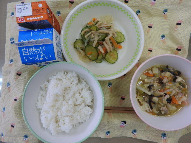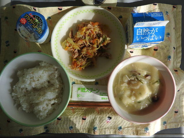 今日の給食は、カミカミどん、白菜のとろとろスープ、ヨーグルト、牛乳(614カロリー、たんぱく質24.1g)でした。とってもおいしくいただきました。感謝!