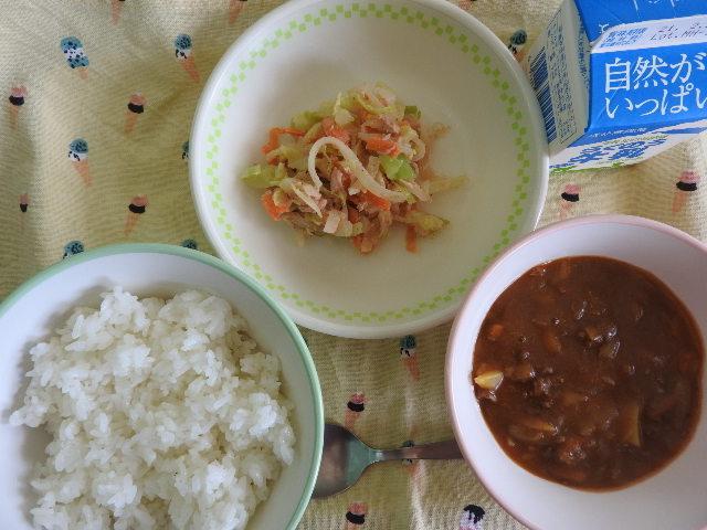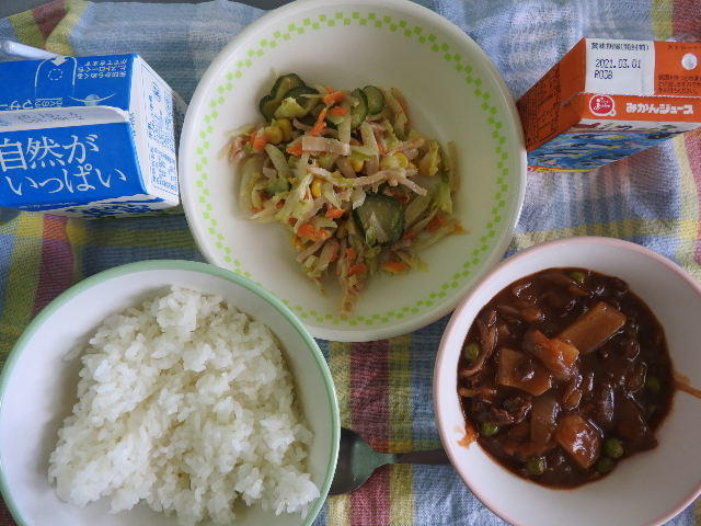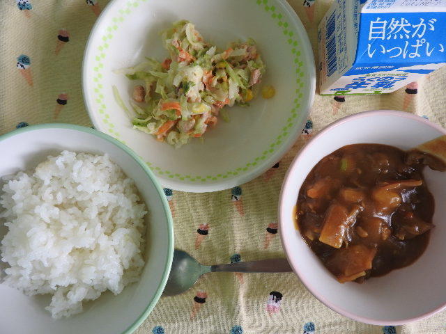 今日のメニューは、秋の野菜カレー、カラフルコールスロー、牛乳 669㎉ タンパク質22.3g 日々感謝!