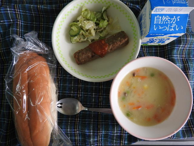 今日のメニューは、コッペパン、クリームシチュー、スティックハンバーグ、グリーンサラダ、牛乳、630㎉ タンパク質25.6g 運動会の片付が終わった後、給食センターにお勤めの保護者の方から、HPでの給食の紹介について、お礼の言葉をいただきました。片付けで疲れていましたが、この一言で元気になり、午後からの会議に臨むことができました。感謝。