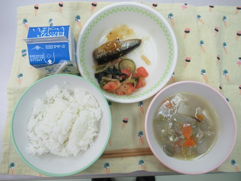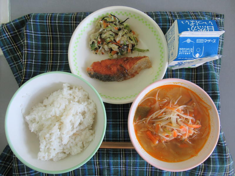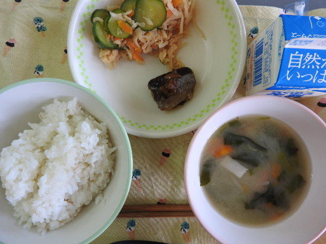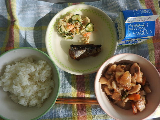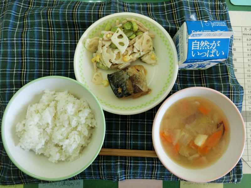 今日の給食は、むぎごはん、季節のみそ汁、さばのゆずみそ煮、ハムレンコンサラダ、牛乳(694カロリー、たんぱく質24.4g)でした。今日もおいしくいただきました。