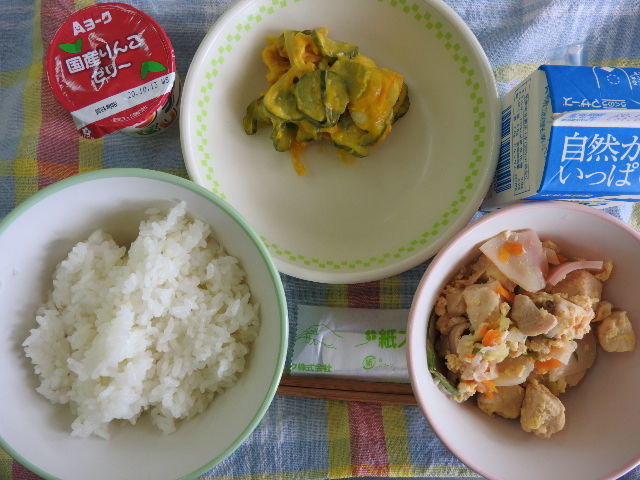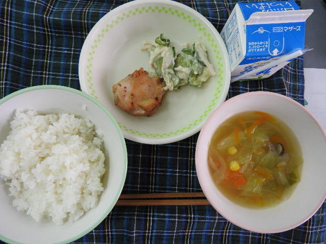 今日の給食は、ごはん、トマトとたまごのスープ、チキンのねぎソース、かぼちゃサラダ、牛乳(644カロリー、たんぱく質22.5g)でした。今日もおいしくいただきました。