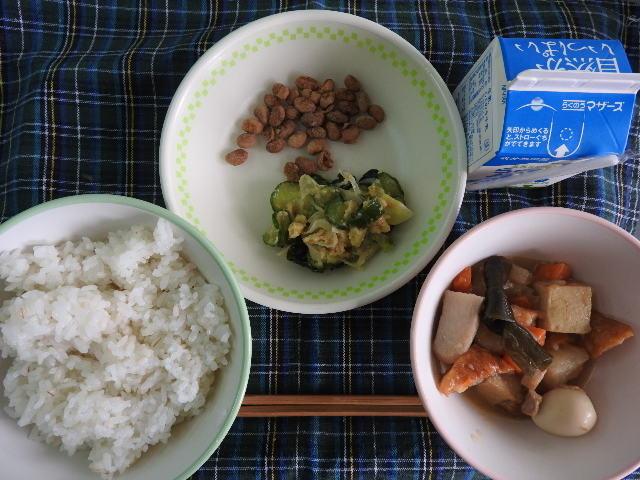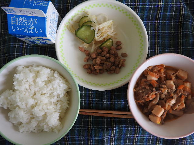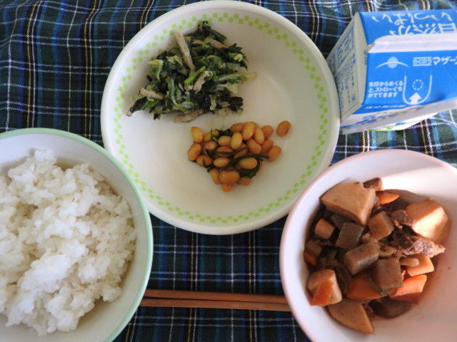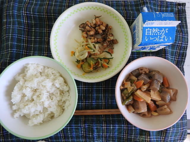 今日のメニューは、麦ごはん、筑前煮、大豆のかりんとう、すきこんぶ和え、牛乳 609㎉ タンパク質22.5g 昨日は給食がありませんでしたので、給食のありがたさを感じながら美味しくいただきました。感謝!