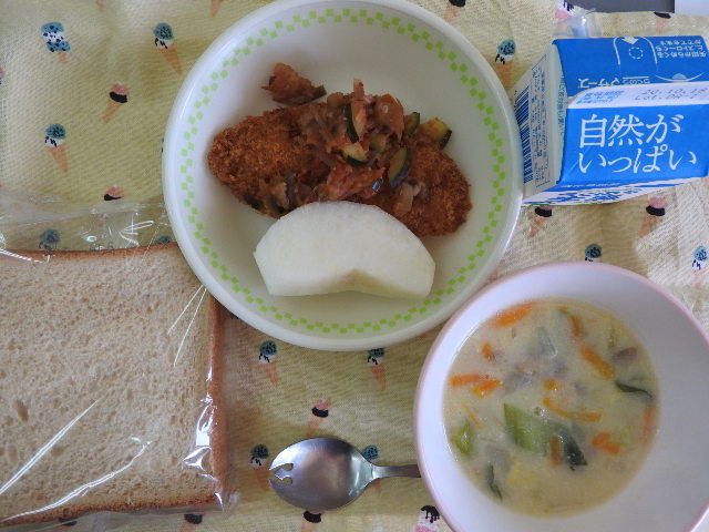昨日のメニューは、米粉パン、牛乳、白インゲン豆のホワイトスープ、チキンナゲット、ブロッコリーとツナのサラダでした。画像は、今日のメニューです。
