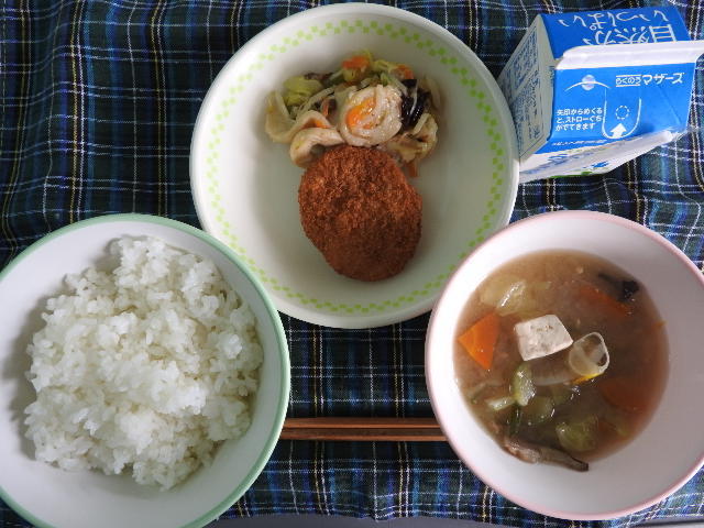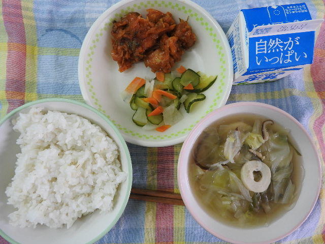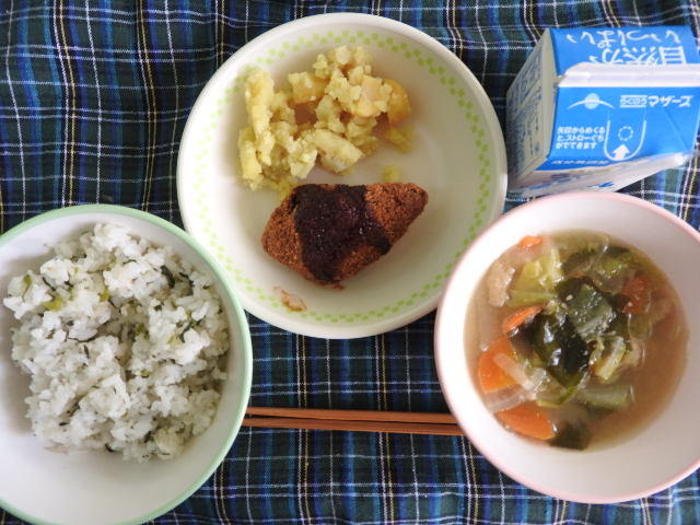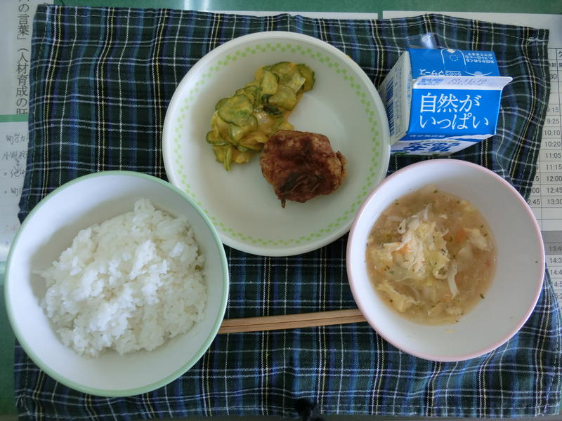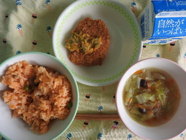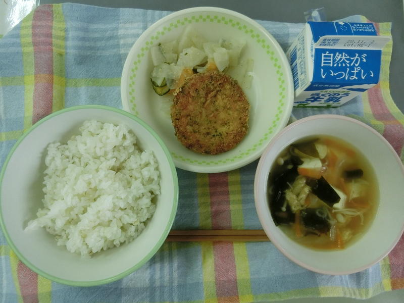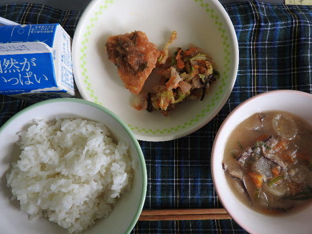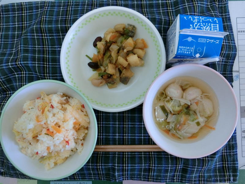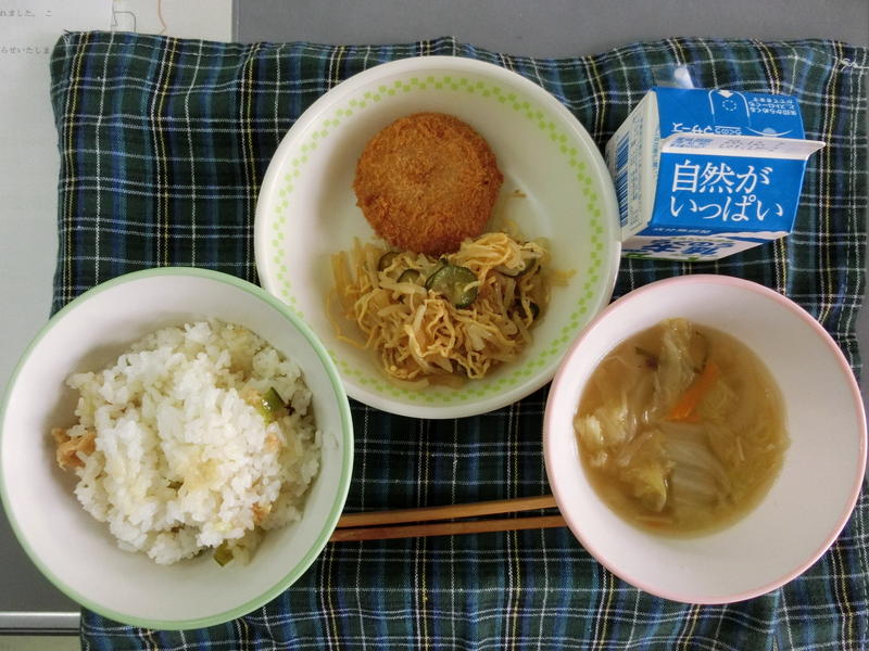 今日の給食は、なんかんあげごはん、きのこと白菜のスープ、コロッケ、中華あえ、牛乳(680カロリー、たんぱく質18.4g)でした。今日もとてもおいしくいただきました。
