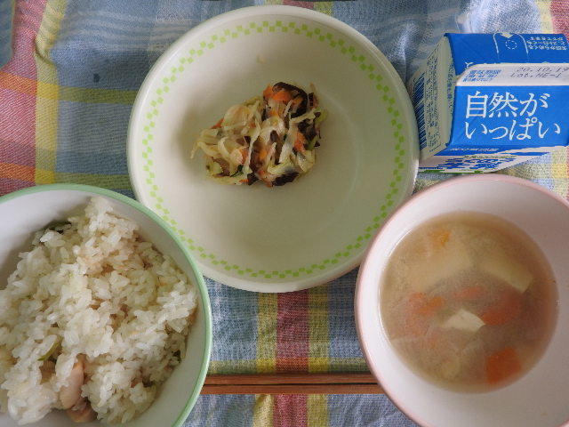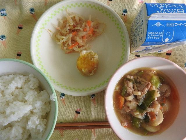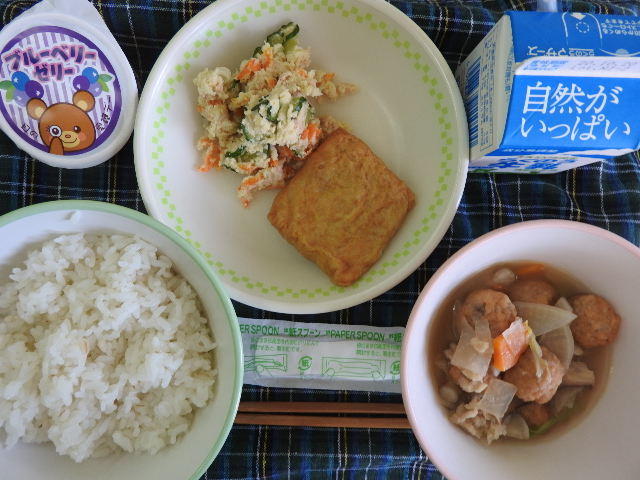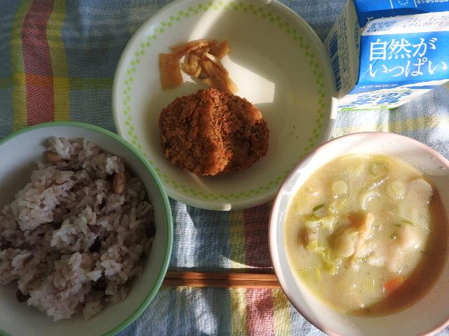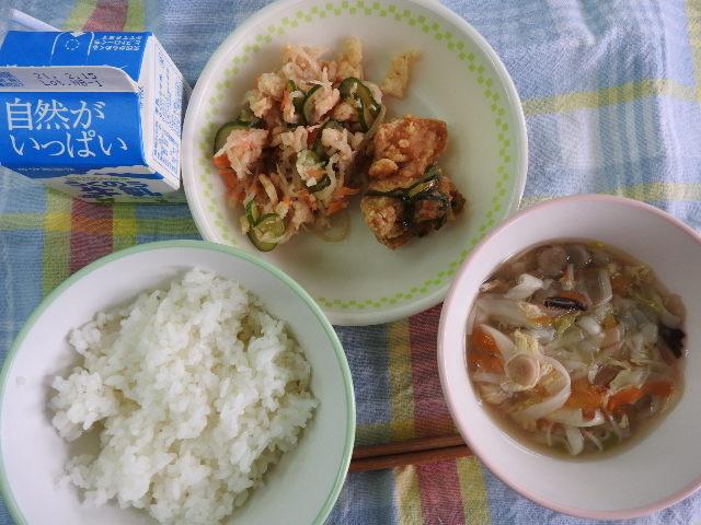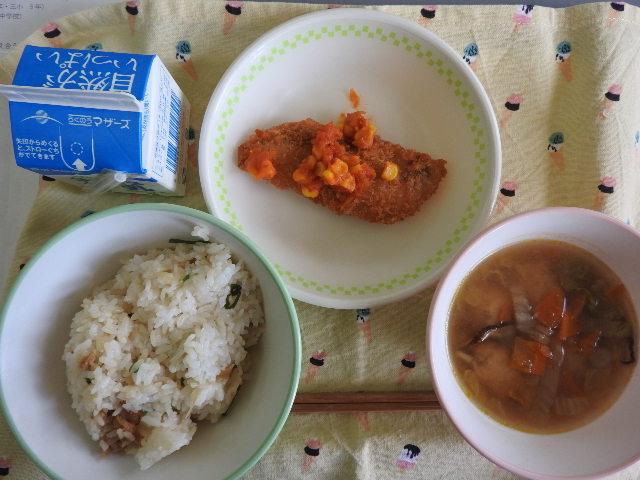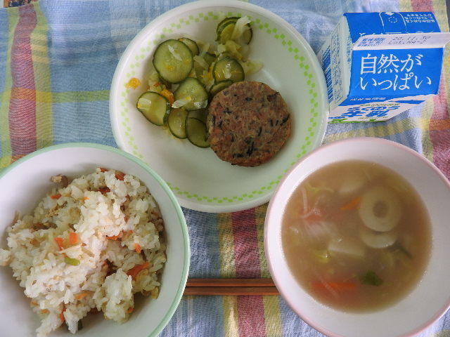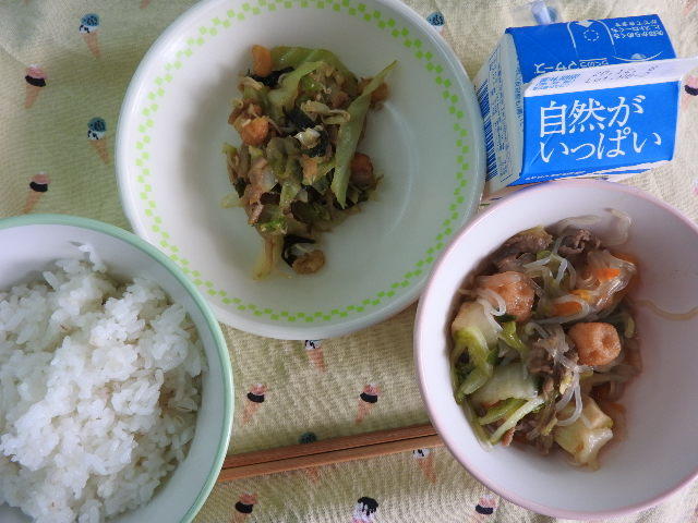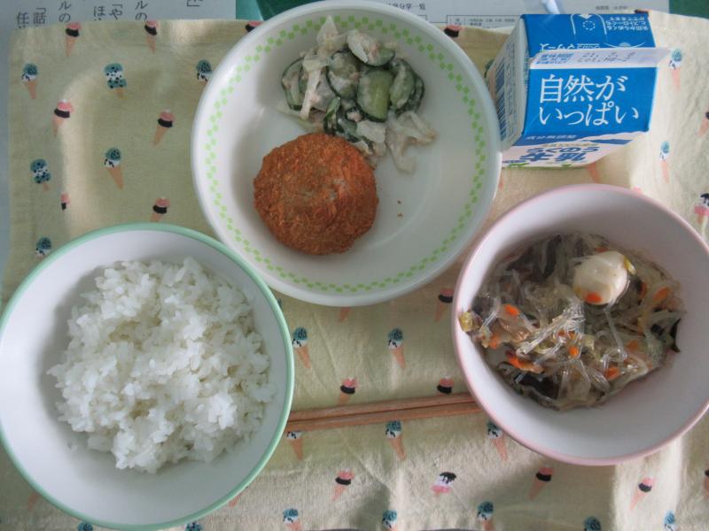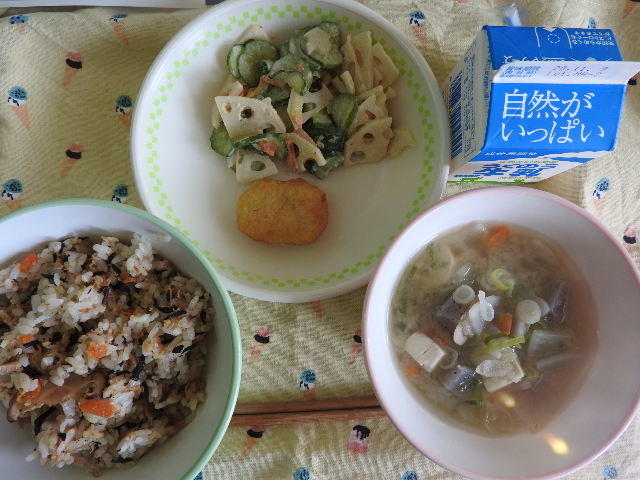 今日の給食は、なんかんあげごはん、きのこと白菜のスープ、コロッケ、中華あえ、牛乳(680カロリー、たんぱく質18.4g)でした。今日もとてもおいしくいただきました。