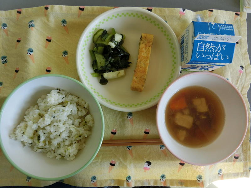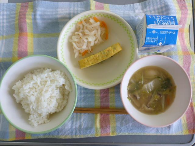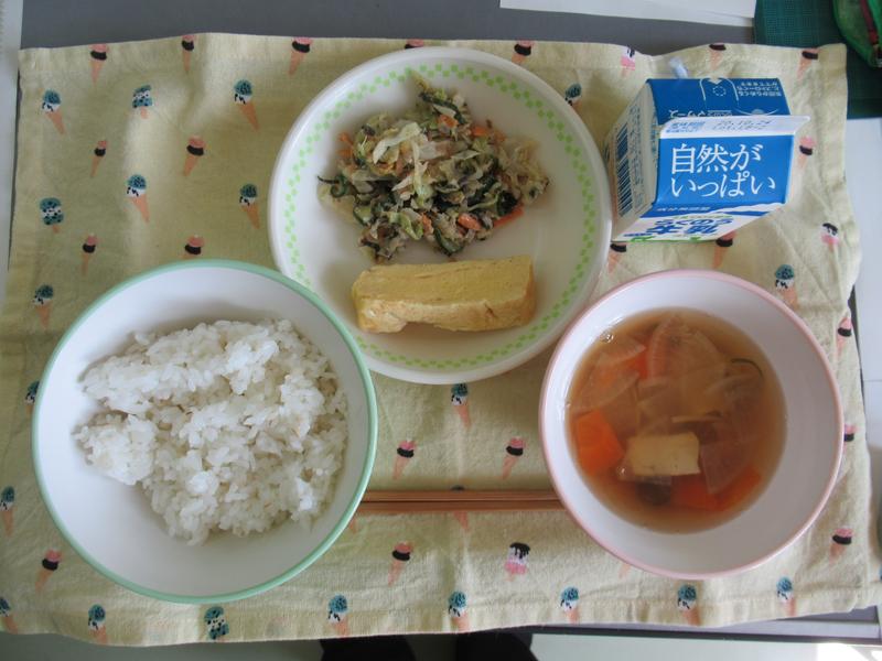 むぎごはん、きのこじる、たまごやき、のりかつサラダ、牛乳(574カロリー、たんぱく質22.4g)でした。ごちそうさまでした。