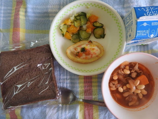 今日のメニューは、黒糖パン、牛乳、ポークビーンズ、かぼちゃグラタン、みかんサラダ 641㎉、タンパク質24.9g かぼちゃグラタンを初めていただきました。感謝。