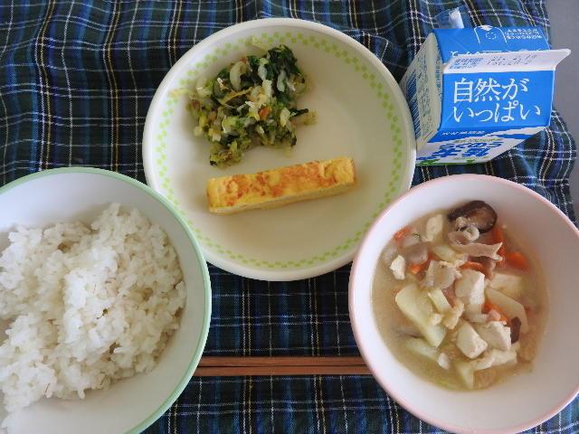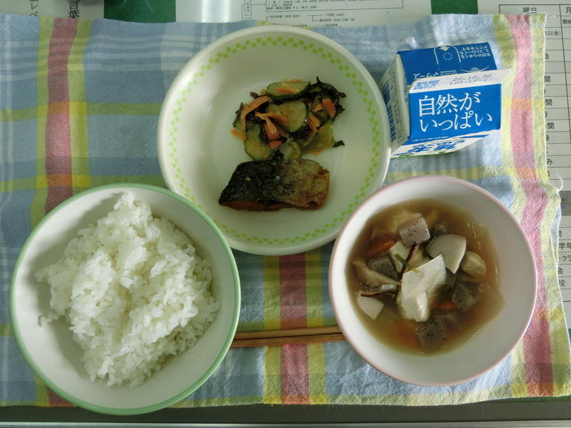 今日の給食は、なめし、のっぺい汁、千草やき、小松菜とイカのすみそあえ、牛乳(573カロリー、たんぱく質20.9g)でした。ごちそうさまでした。