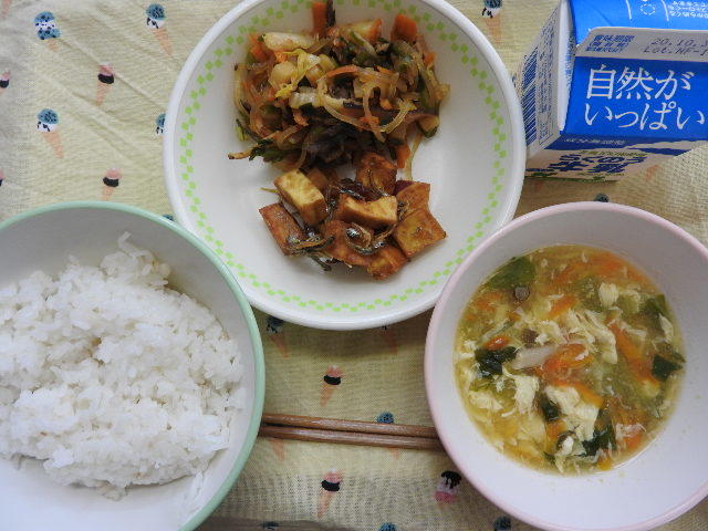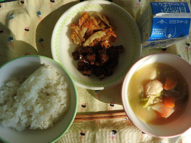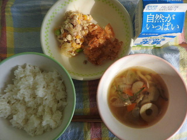 今日の給食は、キムチチャーハン、こんぶとだんごのスープ、さかなとまめのあげに、牛乳(528カロリー、たんぱく質22.3g)でした。感謝!