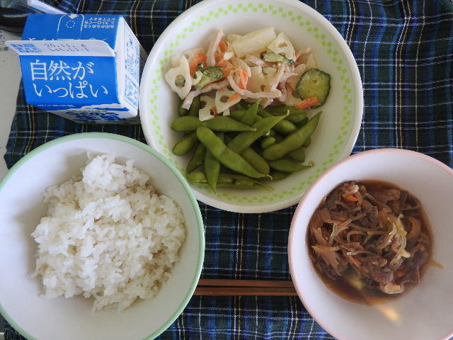 今日のメニューは、牛丼、辛子蓮根サラダ、枝豆、牛乳 711㎉ タンパク質24.8g