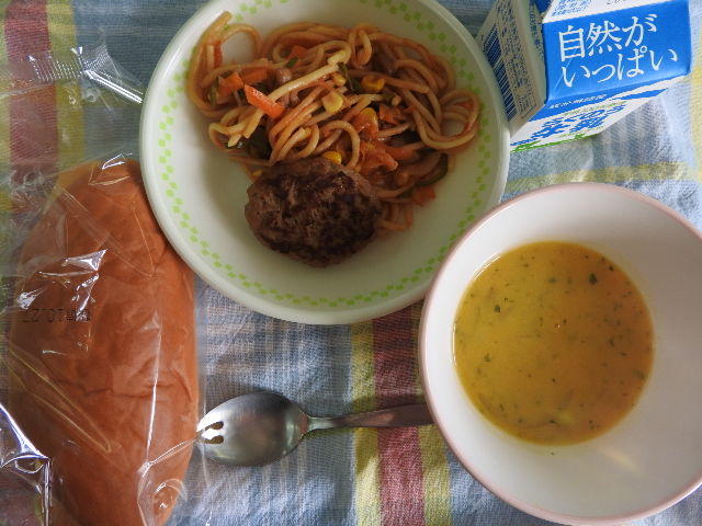 今日のメニューは、ミルクパン、牛乳、にんじんポタージュ、ハンバーグ、ナポリタン 580㎉ タンパク質21.8g 今日も感謝!