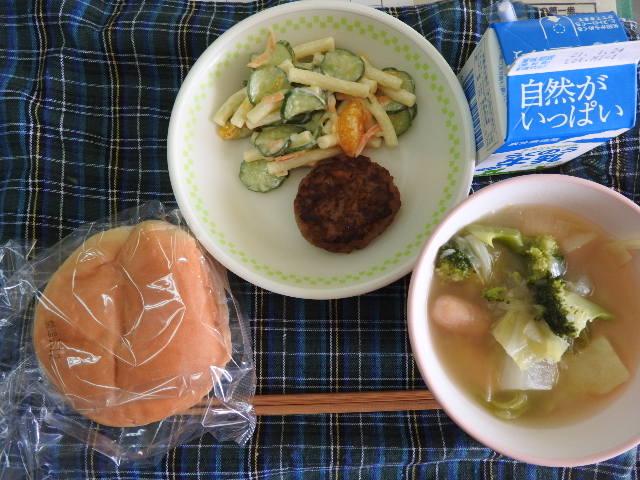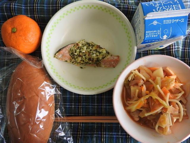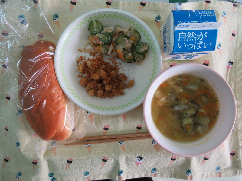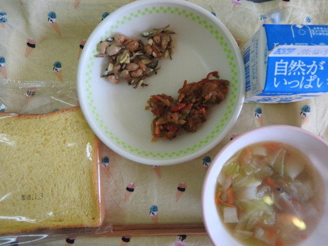 今日のメニューは、米粉入りかぼちゃパン、牛乳、ベーコンとかぶのスープ、ミートボールのケチャップ和え、いりことナッツの豆乳和え 636㎉ タンパク質25.7g 今日のメニューは、それぞれのメニューの名称が凝っているなあと、感じました。でも、名称とは関係なく、いつものように感謝しながら美味しくいただきました。