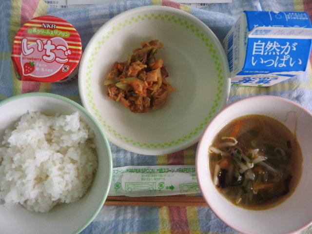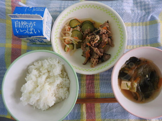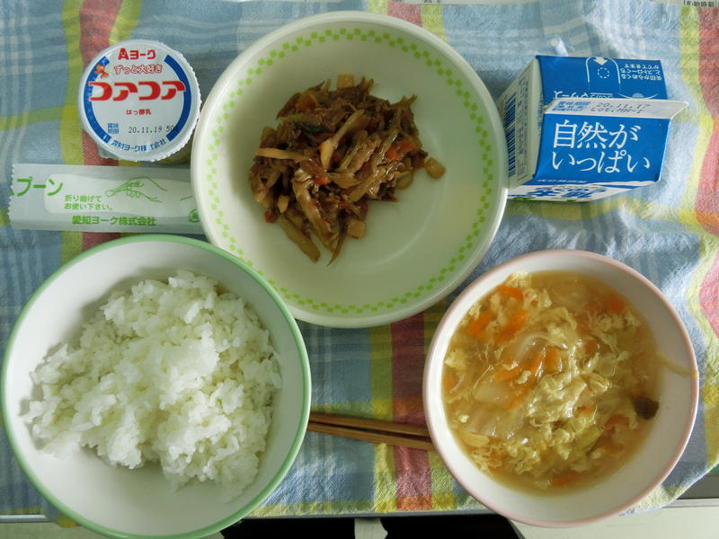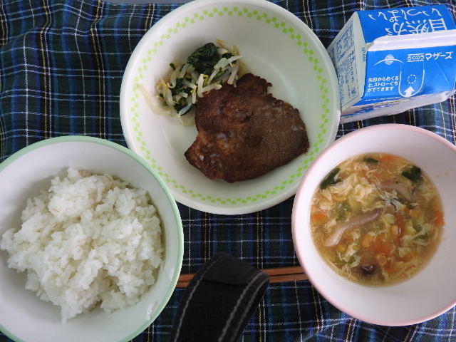 今日のメニューは、麦ごはん、チンゲンサイと卵のスープ、豚肉の生姜焼き、ごま酢和え、牛乳 598㎉ タンパク質26.4g 今日は授業参観です。お世話になります。後ほど様子をお伝えする予定です。